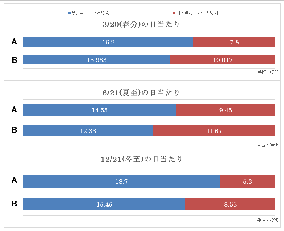 このように日の当たっている時間がBより短くなる理由として、谷型の地形であることが挙げられる。各日の一日の推移を見ると明らかなように、東西どちらの方角も急な斜面に挟まれているため午前・午後ともに平地より影の差している時間が長い。