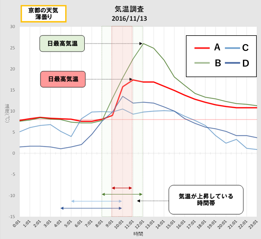 気温が上昇している時間は、日の出から南中すぎまでの間で日照が確実にある時間帯といえる。故にこの時間が長いほどその地点における日照時間は長くなると考えられる。Aではこの時間が他3ヵ所よりほぼ短くなっている=日照時間が短い。特に同様の経緯度に位置するBと比較すると、Bより気温が上昇し始めるのが約1時間遅く、下降し始めるのが数時間早い傾向が見られる。11/13、11/18のグラフを詳しく見ると気温が上昇している時間帯のグラフの角度=気温の上がり方はほぼ同様であるにも関わらず、Aの方が早く気温が下降し始める。つまりAはBと比べて日光が当たっている時間内での光の強さに大差はないが、日照時間自体が短いということが分かる。