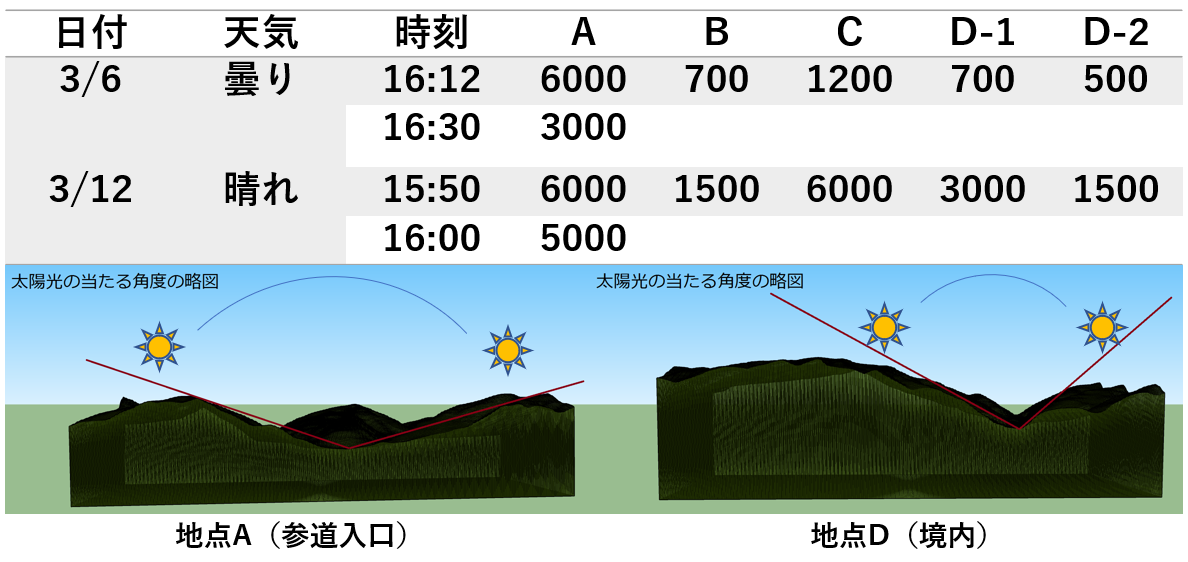 Aエリアから5か所をピックアップし、実際の照度を調べたところ、全般的に薄暗かった。調査中に最も大きな値を記録したA地点においても照度は6,000Lxであるが、これは平地における雨天時の照度(およそ15,000Lx)を大きく下回る。さらに、最も低い照度を記録したのは本宮に最も近いD1,D2地点であった。照度がA>D1、D2となる理由としては上の図のようにDの方が急斜面に囲まれていることが挙げられる。また、D1>D2となることについてはD2周辺に木や建物等の障害物がより多かったことが原因として考えられる。