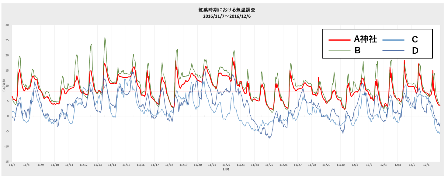 紅葉に必要な気温の条件は『夜間の低温』である。C・Dにおいては、日最低気温が連日8℃を大きく下回っている。これは赤色色素の合成に有利な環境である。それに対しA・Bでは8℃を下回る日が少なく、夜間に比較的高い気温下に置かれている。これは色素の合成を妨げるため紅葉において望ましい環境とは言い難い。しかしながら、Aとほぼ同様の日最低気温であるBでは平均的な紅葉が見られる事から、紅葉に必要な夜間の低温はAにおいても満たされているということがわかる。ただし、極めて色鮮やかな紅葉を求める場合は日最低気温の更なる低下は必要となる。