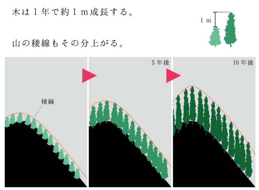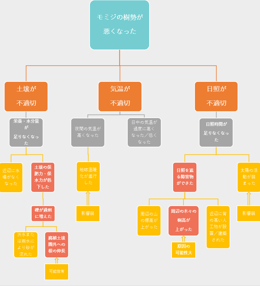 調査箇所周辺の山々には背の高い樹木が多く植林されており、太陽光が遮られやすい。一般的に木は年に少なくとも約1mずつ成長する。これにより山の稜線も同じ分だけ上がる。つまり、山の稜線は10年間で10mも上昇していることとなる。これにより太陽光が遮断され、数年前まで順調に成長していた周辺の木々が徐々に育成不良となる。このような状況は、モミジが徐々に紅葉しなくなったというA神社の現状と符合する。さらに、調査箇所が山の谷間に位置していることも、周辺の木々の樹高が高くなった際の日照量をより低下させやすくしている。