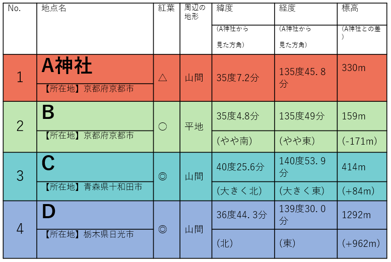 今回は、調査対象のA神社・同じ京都府内にあって紅葉の名所であるB神社・東北の紅葉の名所・C、関東の紅葉の名所Dのデータを比較するという方法をとりました。