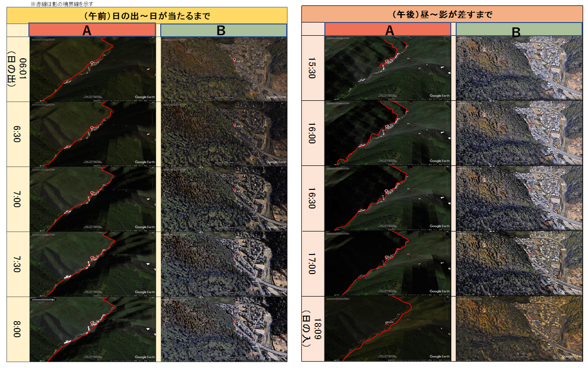 GoogleEarth日照シミュレート機能を使用し、2016/3/20・6/21・12/21各日のAとBの太陽の動きを動画にて撮影。目視にて確認し、各調査箇所の影の濃度が薄まり始める時間を「ポイントに日が当たり始める時刻(X)」、影の濃度が濃くなり始める時間を「ポイントに影が差し始める時刻(Y)」とし、(X-Y)を「日の当たっている時間」とした。(「日の当たっている時間」は厳密な日照時間とは異なる。)様々な太陽の高度の日における調査箇所周辺の影の動きを観察し、地形における問題点を考察する。