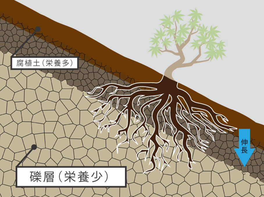 礫が多いということは水や養分の保持力が低下している可能性があるといえる。礫が多すぎると土壌の保水性・保肥力が低下してしまう。とはいえ透水性と通気性を保つためにある程度の礫は必要なので、礫の量を3割程度にして腐植土を増やすと効果的である。特に中層と下層ににその傾向が見られまた。下層に礫が多い場合は空気を求めて根が伸長するため現状のままの方が良いと考えられる。また、土壌全体の色が比較的白く、腐植が少ないことが分かった。
