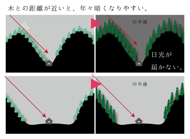 日光を遮る障害物(ここでは木々)の高さが年々上がっていく場合、障害物との距離が近いほど日照量が低下しやすくなる。山の急な稜線に挟まれたA神社周辺は、木との距離が平地よりはるかに近いため、このように樹木が生長していった結果日照不足となりやすい。環境調査により、樹木などの障害物が日光を遮る現地の状況が確認されている。これらの障害物を取り除くことで日照量は増加すると考えられる。