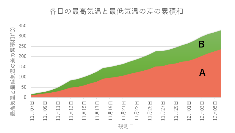 となるため、一般的に言われるとおり寒暖差の大きさは紅葉のしやすさを示す一つの指標と言える。AとBの寒暖差の多寡は、下のグラフを見ると明瞭である。